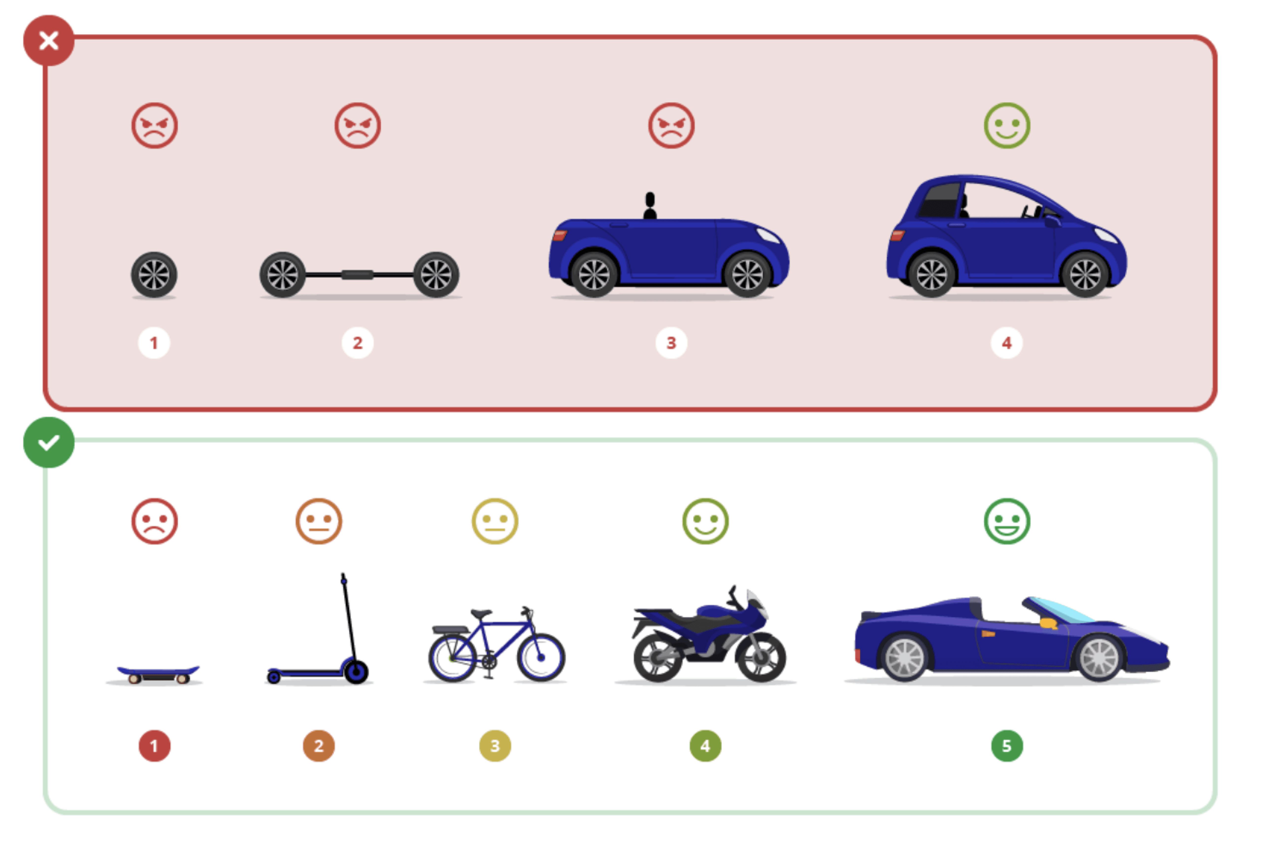 Look at the top row of our header image. The goal is a car. Stage 1 is a wheel. Can you go anywhere on a wheel? No. Stage 2 is an axle. Still useless. You don't have a functional product until Stage 4. This is the "Waterfall" trap. You spend 12 months and $200k building something that might not even be what the customer wants.
